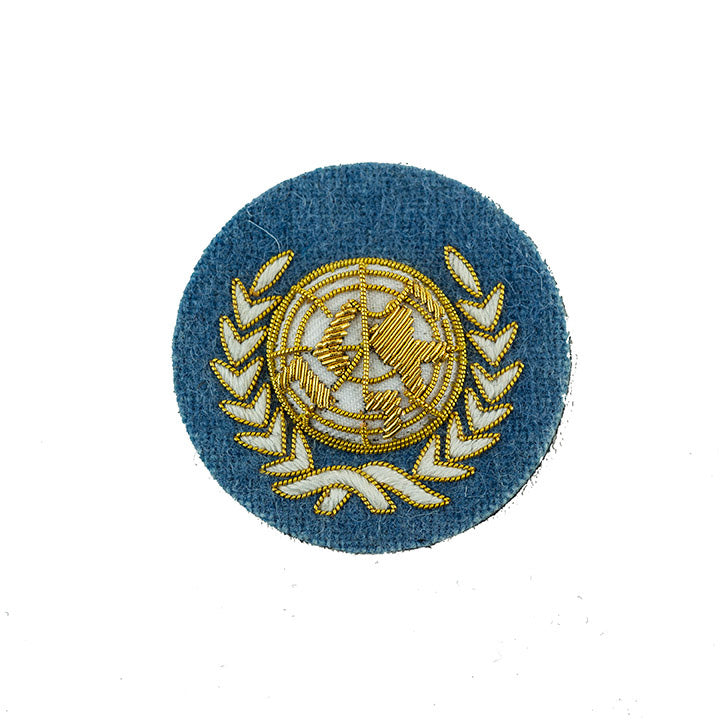 United Nations Officers Embroidered Beret Badge, hand embroidered in gold wire on a sky blue background